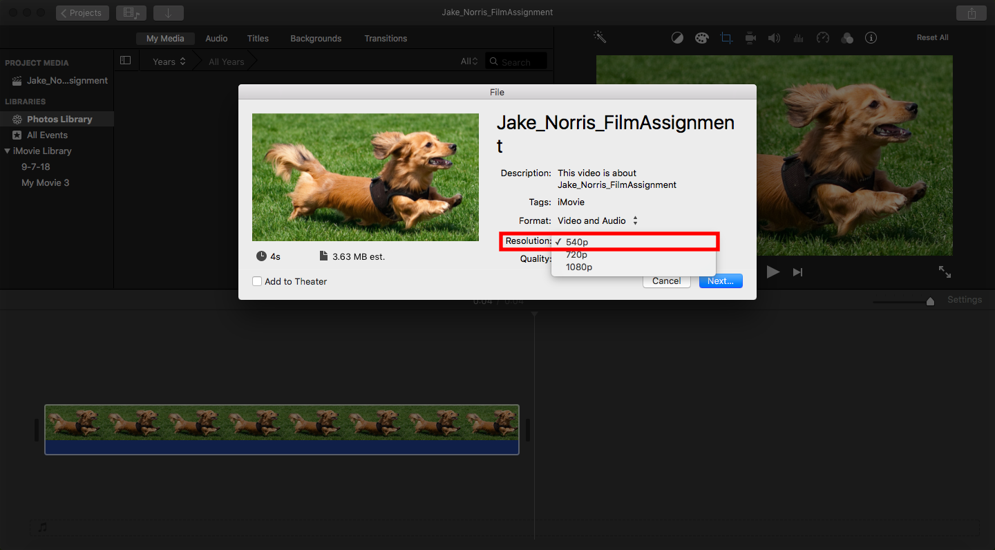 - Click on the Resolution Menu and Select the 540P option. This will ensure that you can easily and quickly upload your movie to SEQTA Learn